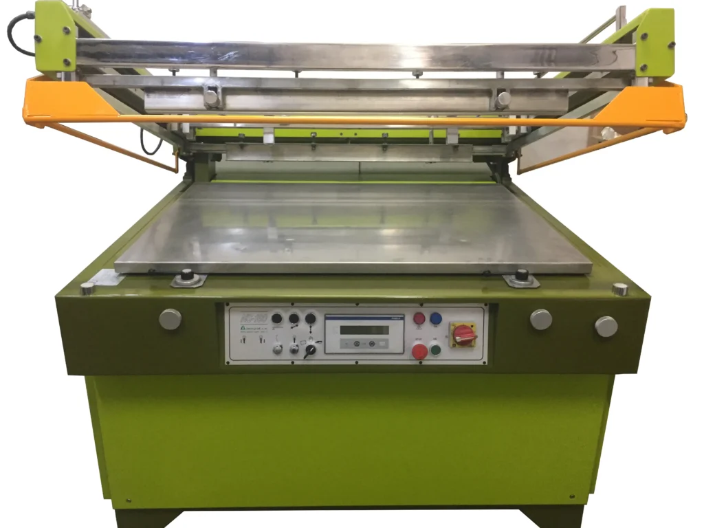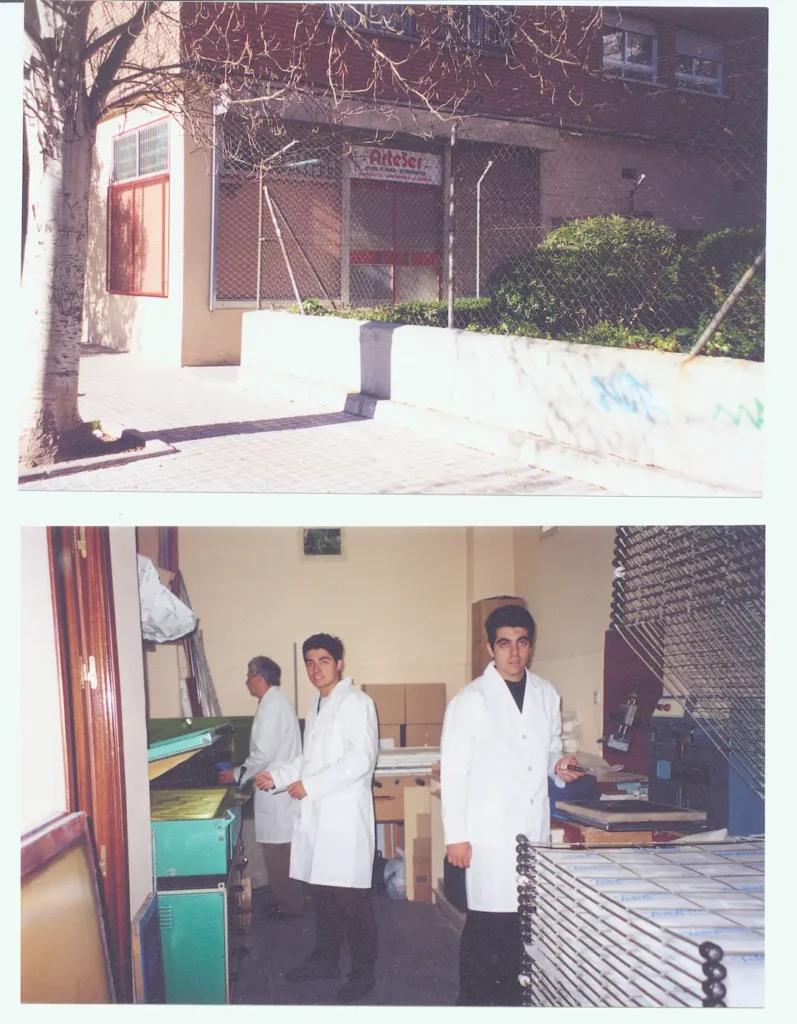 A finales de los 80 empezamos a mecanizar la empresa. Primero compramos varios secadores de varillas con ruedas para aprovechar mejor el espacio y poder secar y almacenar más materiales; compramos una guillotina “Corsomatic” semiautomática con 74cm de boca para no tener que subcontratar el corte de los materiales. También nos hicimos con una máquina de serigrafía eléctrica de 10x100cm que nos permitió poder hacer formatos más grandes de trabajo y así subir la producción.